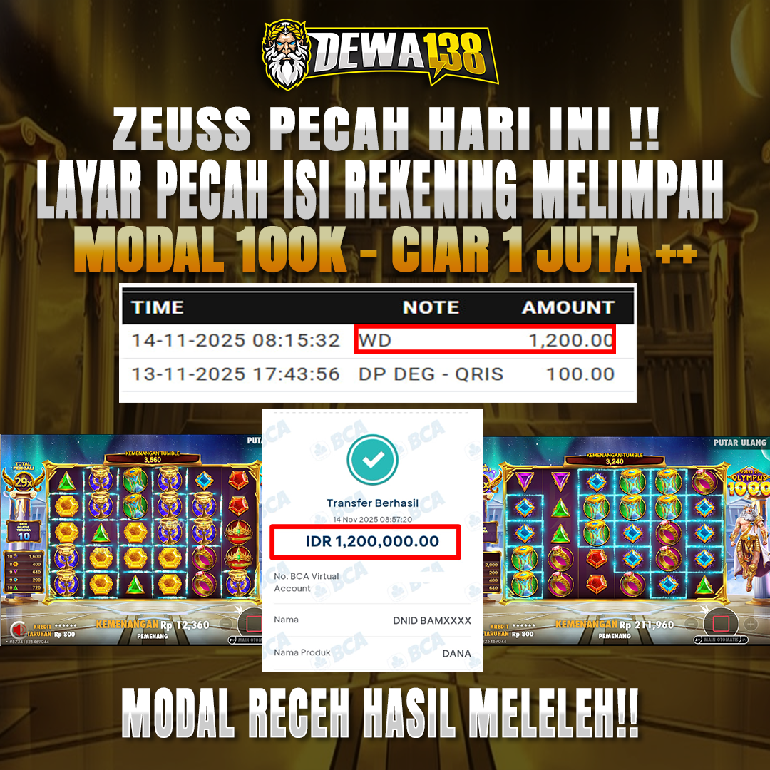 DEWA138 menghadirkan game jackpot vip yang di lengkapi fitur khusus new member hanya dengan modal deposit 100k dijamin akan withdraw 1,5 juta malam ini.